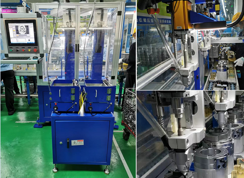 用于壓縮機(jī)泵體生產(chǎn)線,采用視覺引導(dǎo)4軸機(jī)器人實(shí)現(xiàn)法蘭螺釘預(yù)緊